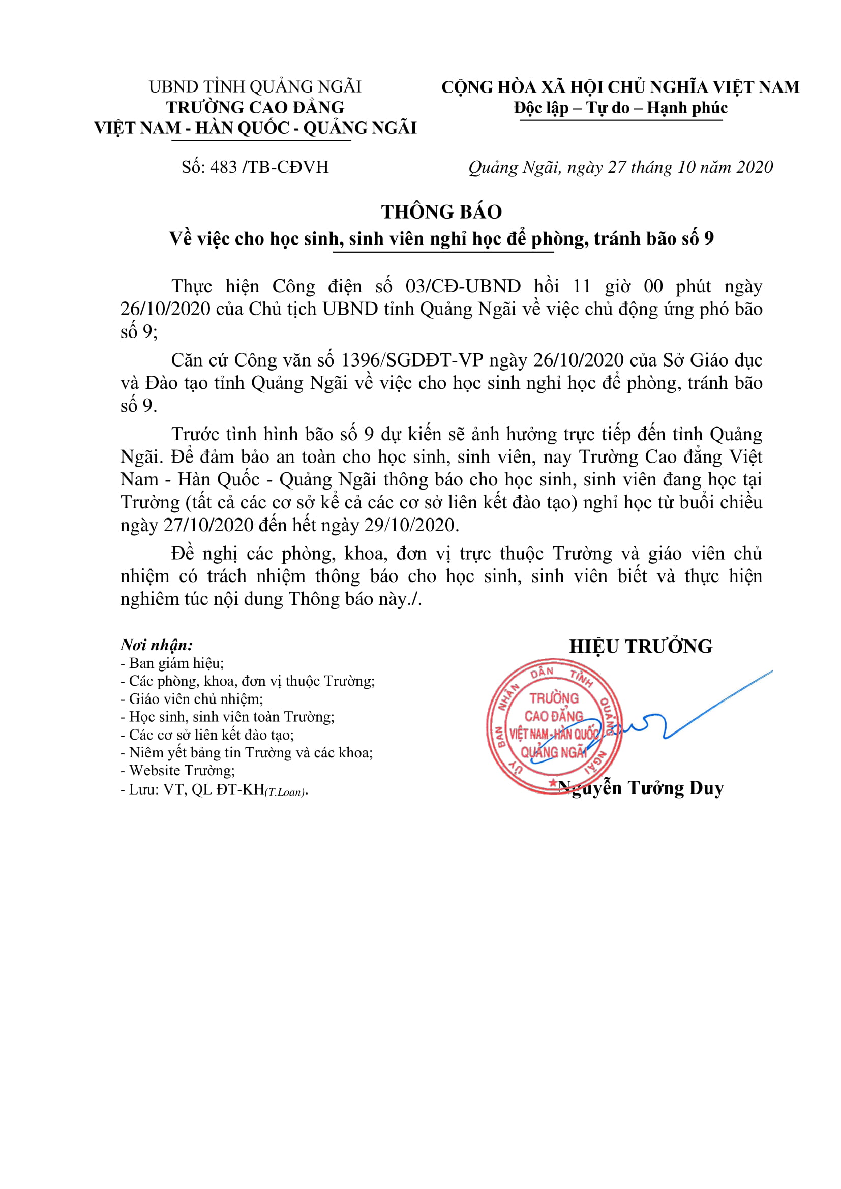 THÔNG BÁO NGHỈ HỌC ĐỂ PHÒNG, TRÁNH BÃO SỐ 9